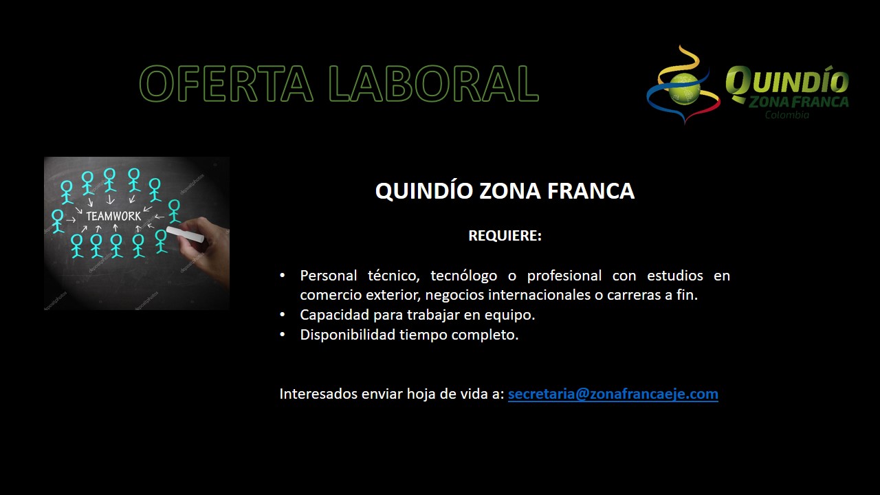 Si deseas trabajar con nosotros y cumples con los requisitos, a partir del lunes 15 de enero hasta las 12:00 PM del jueves 18 de enero del presente año, se estará recibiendo hojas de vida al correo secretaria@zonafrancaeje.com.
